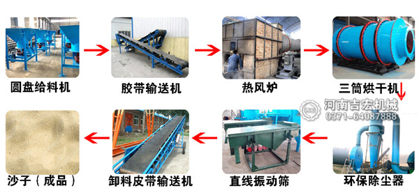 石英砂先經過圓盤給料機被均勻地送入到皮帶輸送機之上,之后通過流沙管進入到烘干機內部,熱風爐內燃料的燃燒產生的熱量在抽風機的作用下進入到主機內與沙子進行接觸,完成熱量的傳遞,快速蒸發水分。我公司生產的沙子烘干機是三回程密封結構,能夠很好的降低熱量的散失,提高熱效率。干燥之后的沙子輸送到直線振動篩進行篩分,之后被提升機送入儲料罐進行儲存或者進行打包裝袋。在接料斗的上部是排放工藝流程之中的塵土等,經過除塵系統處理之后,能夠很好的達到環保的目的。